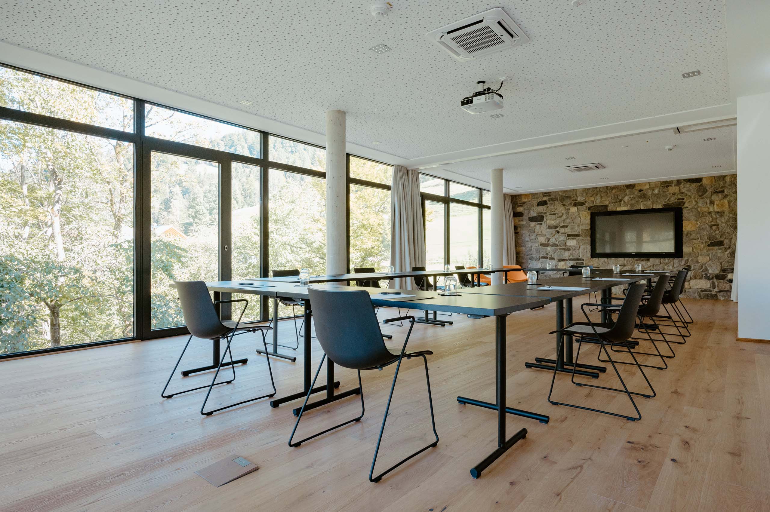 Der schlichte Raum Tanneck ist im Erdgeschoss direkt neben unserer Rezeption gelegen. Bodentiefe Fenster öffnen den Blick ins Grüne und vermitteln Transparenz und Offenheit. Die private Terrasse bietet das ideale Ambiente für Ihre Kaffeepausen oder das Arbeiten im Freien.